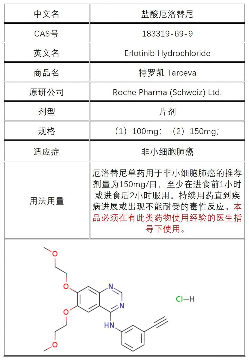 ★鹽酸厄洛替尼于2004年11月獲FDA批準(zhǔn)上市,是全球首個(gè)作用于表皮生長(zhǎng)因子受體酪氨酸激酶的小分子抑制劑,也是首個(gè)用于肺癌靶向治療的小分子藥物,可特異性地針對(duì)腫瘤細(xì)胞作用,抑制腫瘤的形成和生長(zhǎng)。厄洛替尼作是抗腫瘤分子靶向藥物的代表性藥物,在非小細(xì)胞肺癌治療中占有重要地位。