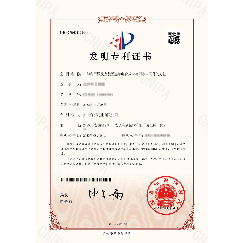 近日,我公司榮獲了”一種利用微反應(yīng)裝置連續(xù)電合成卡格列凈中間體的方法“發(fā)明專利證書,這標(biāo)志著我們在卡格列凈的原料藥中間體生產(chǎn)方面的又一大突破。我們深知,這份榮譽(yù)的背后,承載著的是每一個客戶對我們產(chǎn)品的無比信任和期待。在歷經(jīng)從小試處方研究及工藝研究到中試放大、穩(wěn)定性研究、工藝驗證、放大生產(chǎn)等多個階段,用心研磨,只為提供性價比更高的優(yōu)質(zhì)產(chǎn)品。