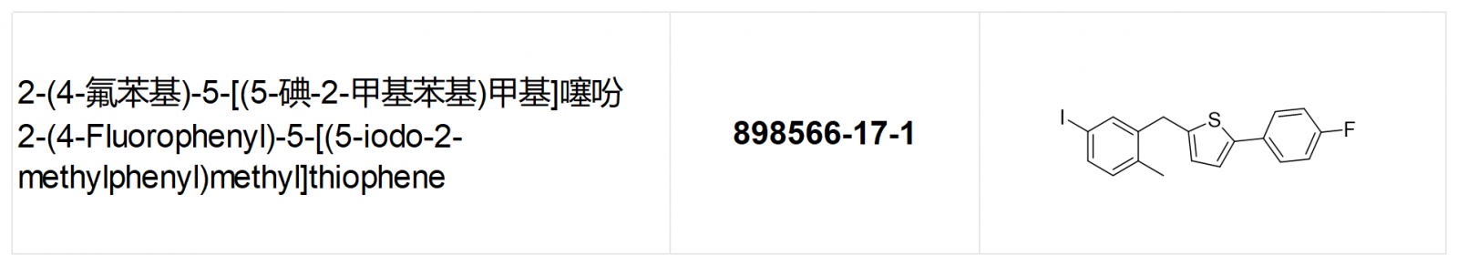 一、898566-17-1基本信息:2-(4-氟苯基)-5-[(5-碘-2-甲基苯基)甲基]噻吩、2-(4-Fluorophenyl)-5-[(5-iodo-2-methylphenyl)methyl]thiophene;